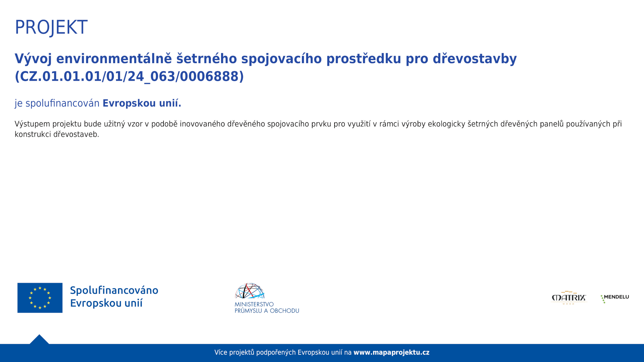 - Vývoj environmentálně šetrného spojovacího prostředku pro dřevostavby (CZ.01.01.01/01/24_063/0006888)